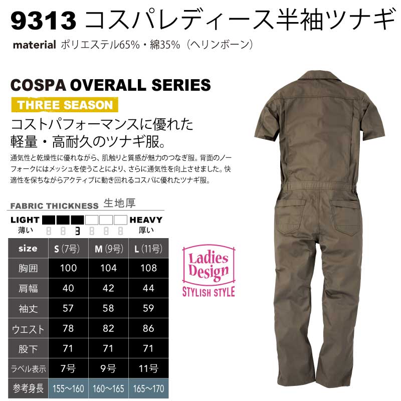■スペック 品番:9313 素材:ポリエステル65%綿35%(ヘリンボーン) カラー:カーキ(08)/ネイビーブルー(22) サイズ:S(7号)/M(9号)/L(11号) 説明 通気性と乾燥性に優れながら、肌触りと質感が魅力のつなぎ服。