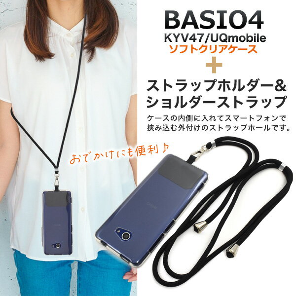 メール便送料無料【 ショルダーストラップ付き BASIO4 KYV47/UQmobile /かんたんスマホ2 A001KC/2+(プラス) A201KC ソフトクリアケース 】 ベイシオ スマホカバー スマホケース シンプル 透明 肩掛け 首掛け ストラップホルダー おしゃれ 便利 カラフル